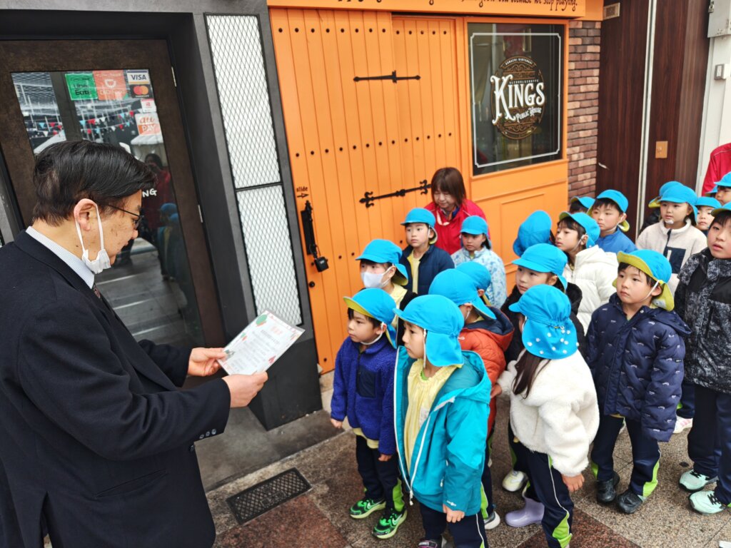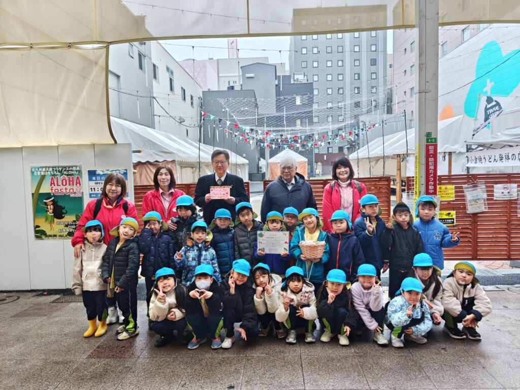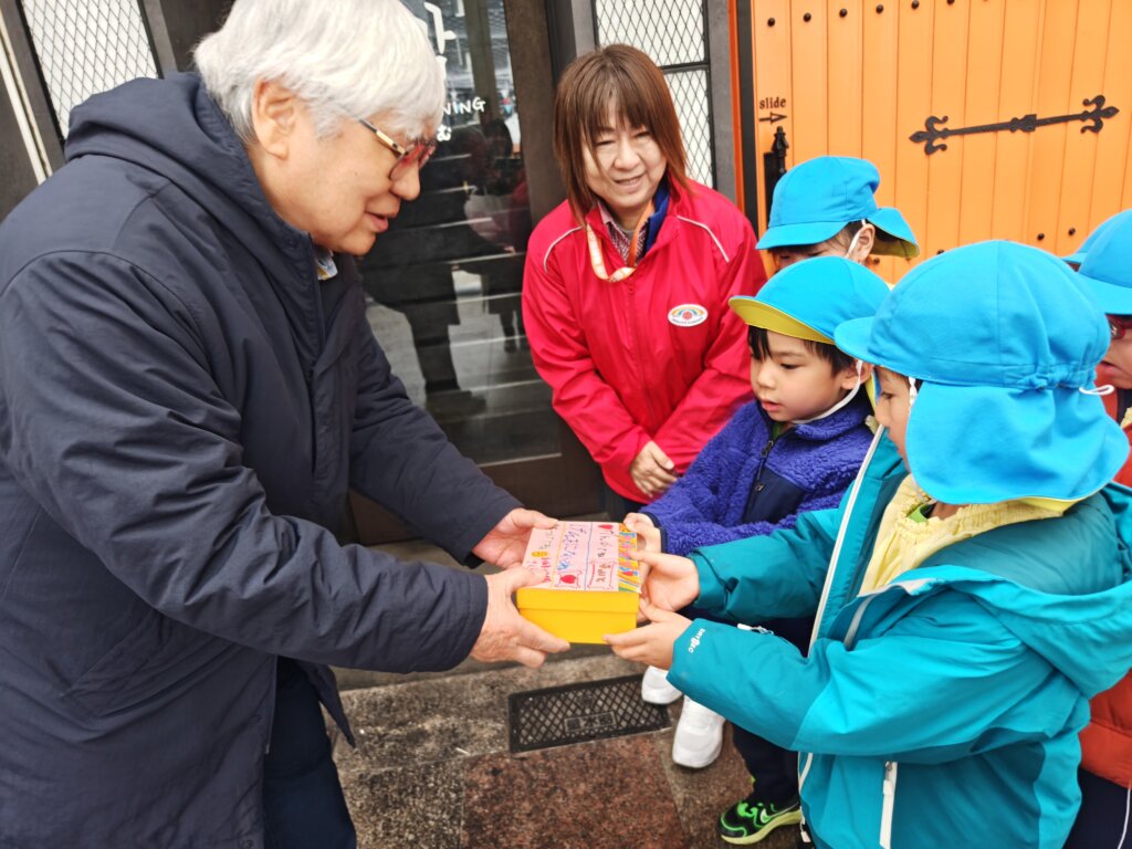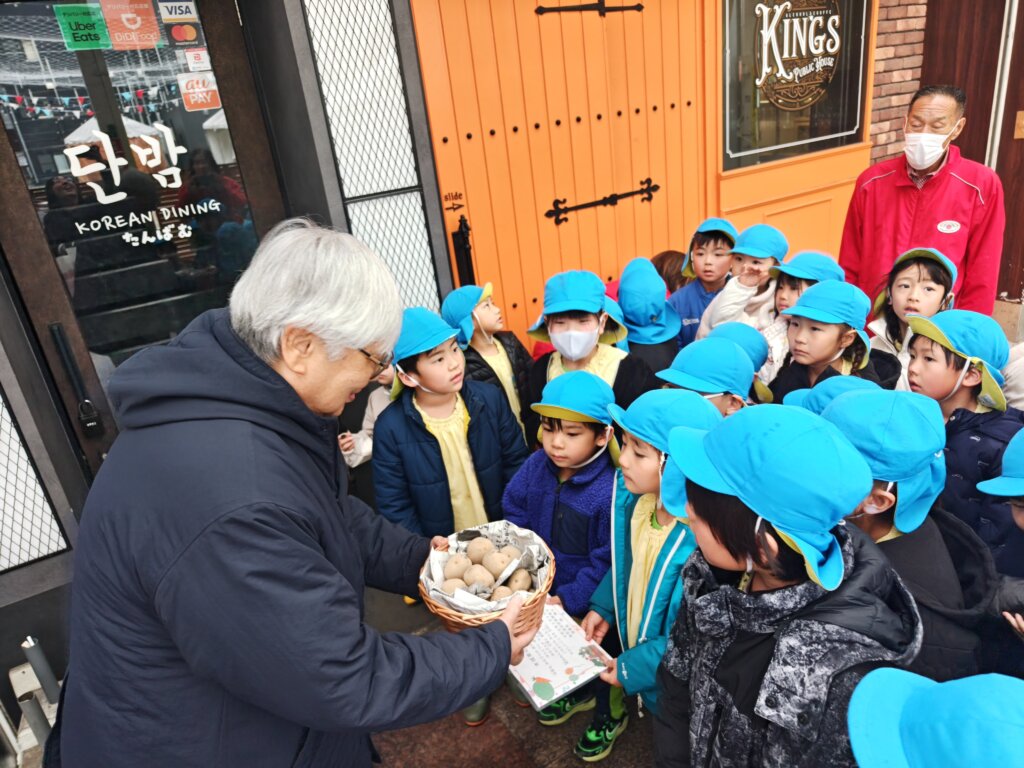 本城東幼稚園の園児たちが今年も自分たちで育てた野菜の販売で得た売り上げを「魚町1丁目の火災復興に役立ててほしい」と、届けてくださいました。